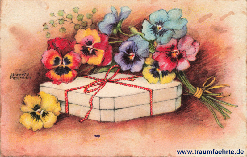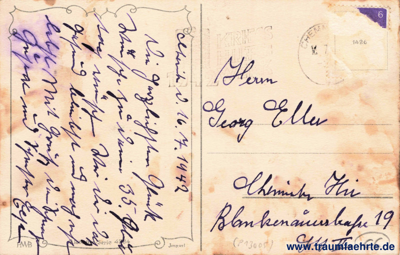 – Details – Jahr: ca. 1940 Status: gelaufen 1942, Briefmarke entfernt Beschriftung vorne: Hannes Petersen Beschriftung hinten: HWB, Alabaster-Serie 4384, Import, 1426 Stempel: Chemn[itz], M 7[…]; Kriegshilfswerk 1942 Hinweis: