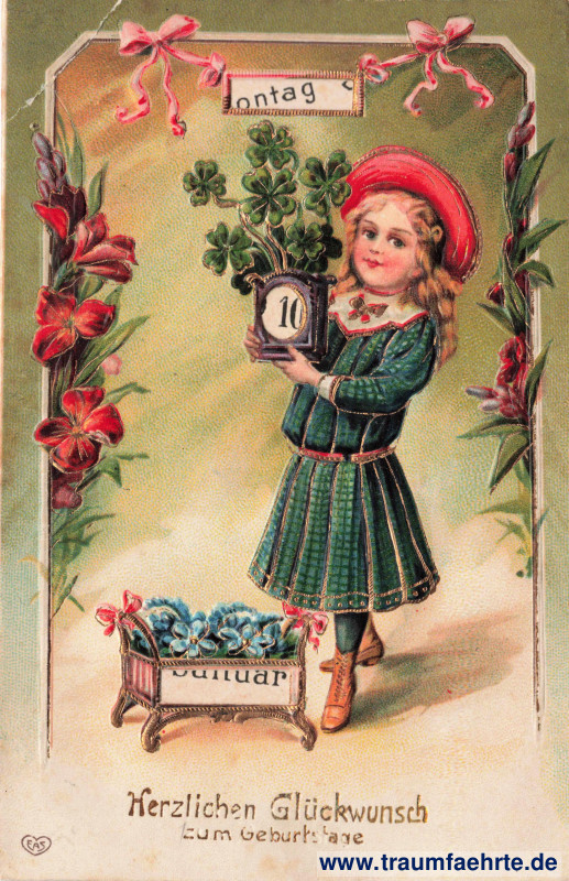 Schlagworte: Glückwünsche, Geburtstag, Mädchen, Kleider, Blumen, Kleeblätter, Reliefkarten, Künstlerkarten, Drehscheiben, Gold
