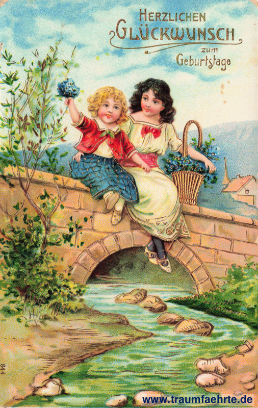 Schlagworte: Glückwünsche, Geburtstag, Mädchen, Brücken, Bäche, Steine, Blumen, Reliefkarten, Künstlerkarten, Gold