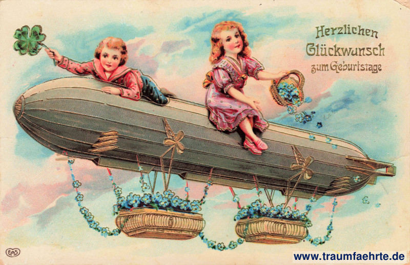 Schlagworte: Glückwünsche, Geburtstag, Zeppeline, Luftschiffe, Mädchen, Blumen, Kleeblätter, Reliefkarten, Künstlerkarten, Gold