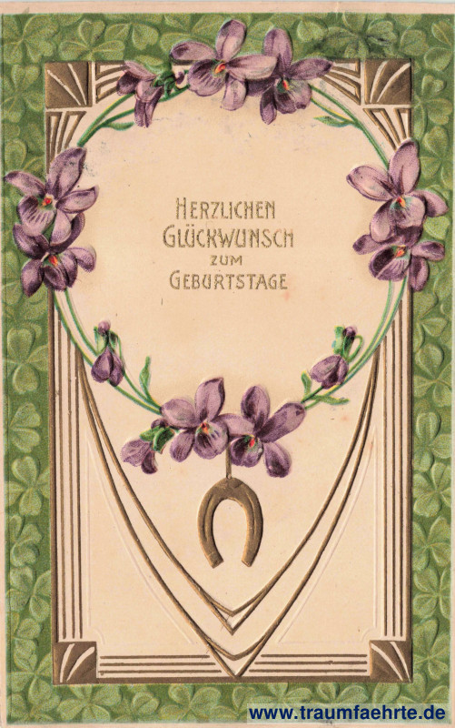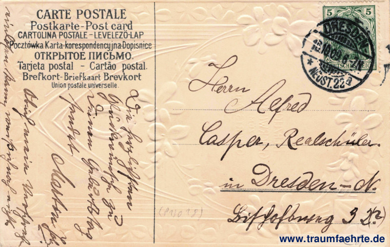 – Details – Jahr: ca. 1905 Status: gelaufen 1909 Beschriftung vorne: Herzlichen Glückwunsch zum Geburtstage Beschriftung hinten: Carte postale, Postkarte – Post card, Cartolina postale – Levelezö-Lap, Pocztówka Karta – korespondencyjna – Dopisnice, Открытое письмо. Tarjeta postal – Cartão postal. Brefkort – Briefkaart, Brevkort, Union postale universelle. Stempel: Dresden-Neust. 22, * a, 1[3].10.09 6–7N Hinweis: