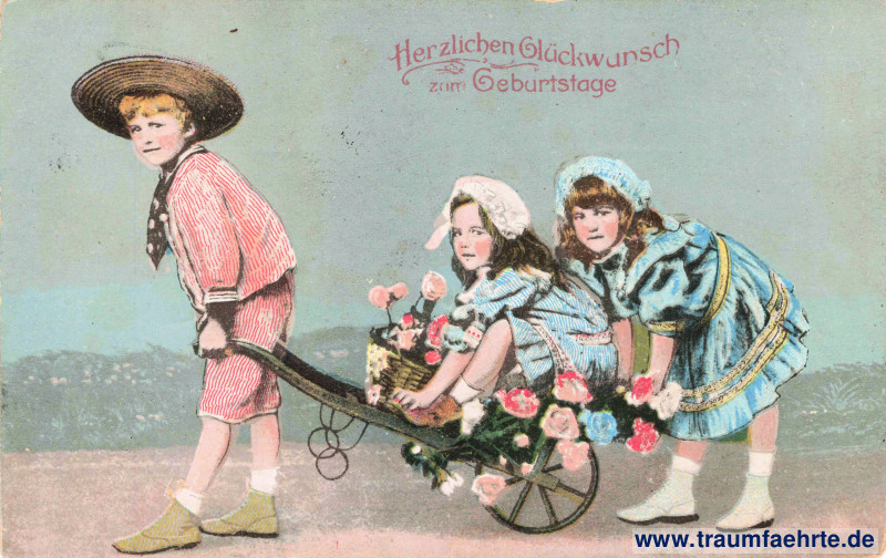 Schlagworte: Glückwünsche, Geburtstag, Handkarren, Blumen, Kinder, Mädchen, Jungen, Kleider, Hüte, Reliefkarten