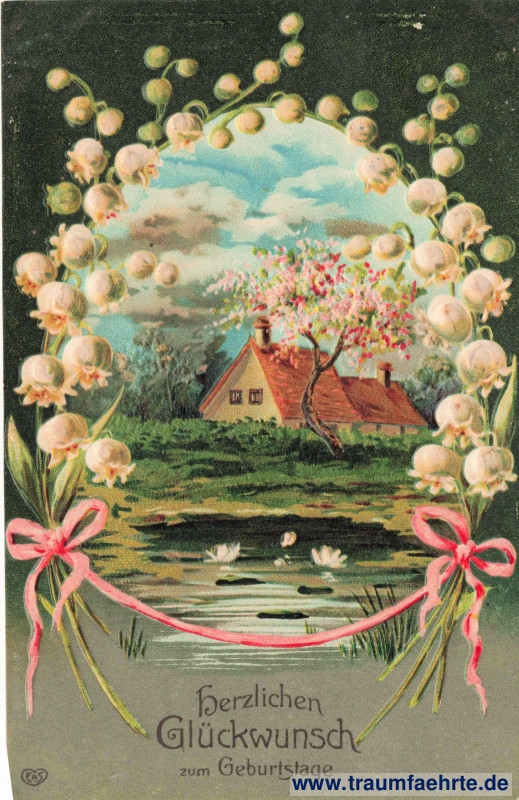farbige Reliefkarte – Teich mit Seerosen, Haus und blühender Baum, dekoriert von Maiglöckchen und rosa Band