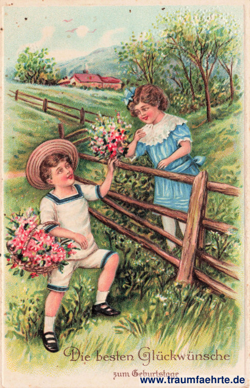 Schlagworte: Glückwünsche, Geburtstag, Wiesen, Kinder, Blumen, Zäune, Hügel, Reliefkarten, Künstlerkarten, Bahnpost
