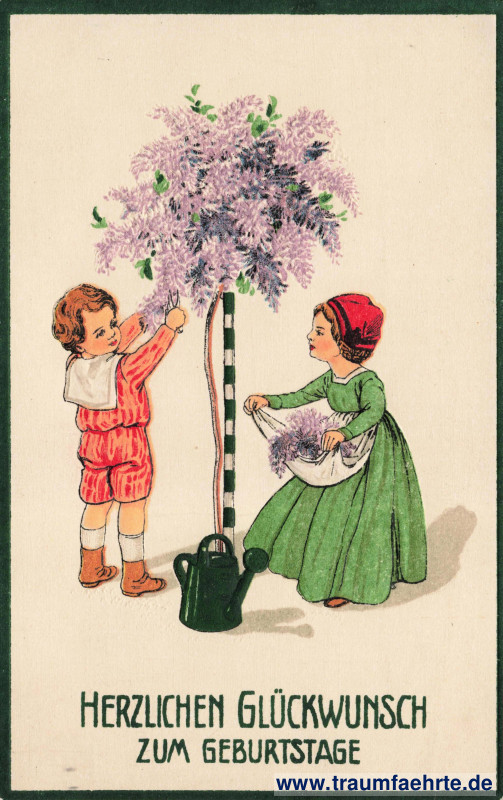 Schlagworte: Glückwünsche, Geburtstag, Kinder, Mädchen, Jungen, Kleider, Blumen, Gießkannen, Reliefkarten, Künstlerkarten