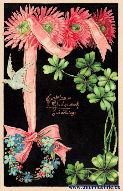Schlagworte: Blumen, Tauben, Vögel, Kleeblätter, Glückwünsche, Geburtstag, Reliefkarten, Künstlerkarten, Gold