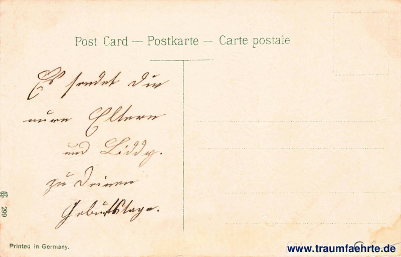 – Details – Jahr: ca. 1910 Status: beschrieben, aber ungelaufen Beschriftung vorne: Herzlichen Glückwunsch zum Geburtstage Beschriftung hinten: Post Card – Postkarte – Carte postale, G G K 299, Printed in Germany. Stempel: keine Hinweis: