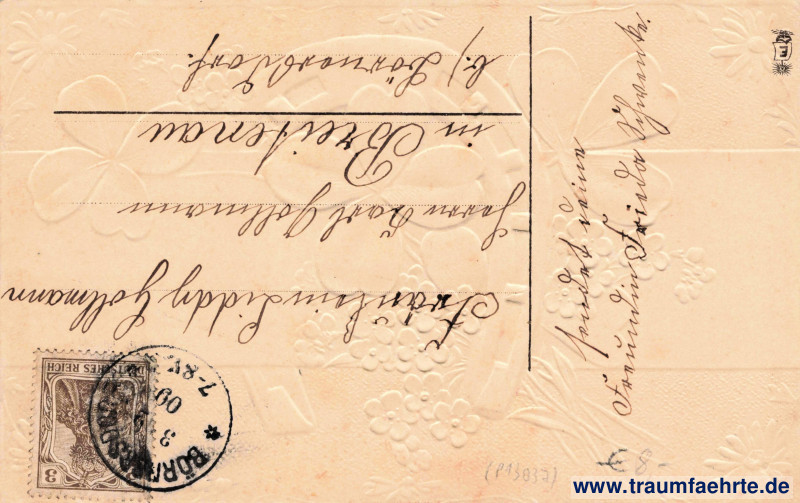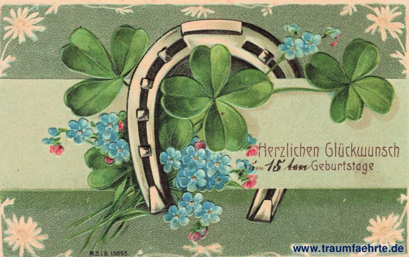 – Details – Jahr: ca. 1905 Status: gelaufen 1909 Beschriftung vorne: Herzlichen Glückwunsch [zum 15ten] Geburtstage, M.S.i.B. 13895 Beschriftung hinten: E Stempel: Bördersdorf, 3 2 09 7–8V. Hinweis: