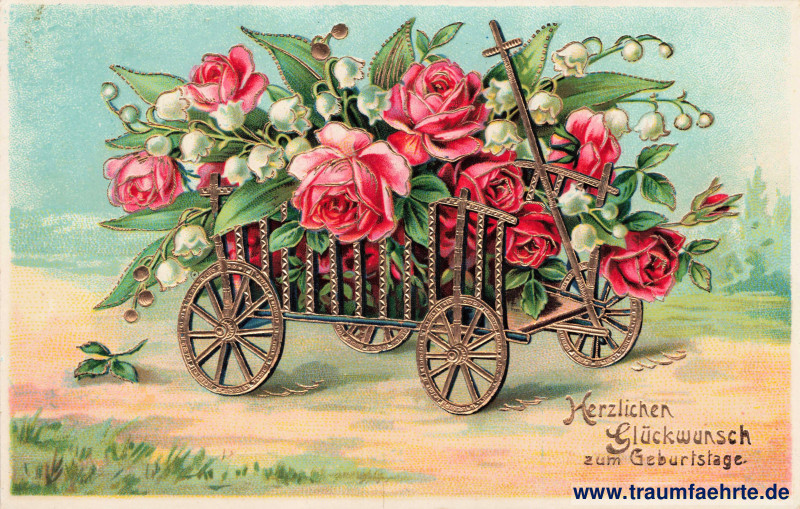 Schlagworte: Glückwünsche, Geburtstag, Blumen, Rosen, Handkarren, Wagen, Reliefkarten, Künstlerkarten, Gold