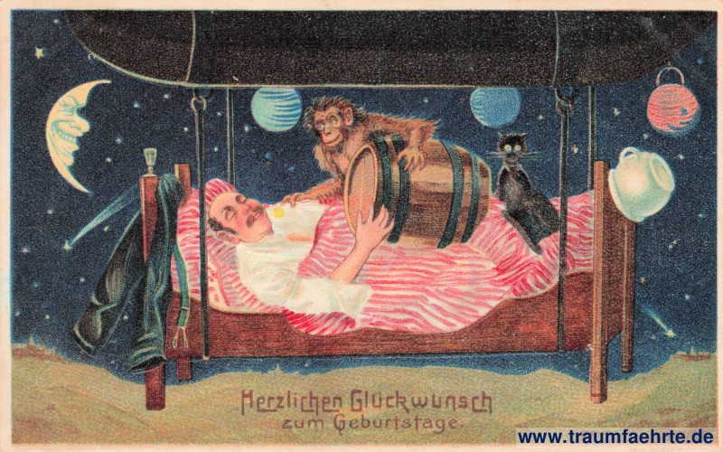 farbige Reliefkarte – schlafender Mann im Schlafanzug im Bett mit Flugballon auf einem fremden Himmelskörper im All mit Uniform an der Seite, Fass, Affe, schwarzer Katze, Nachttopf und Laternen, im Hintergrund Sterne, Sternschnuppen und ein grinsender Mond; gelaufen am 11.11.11