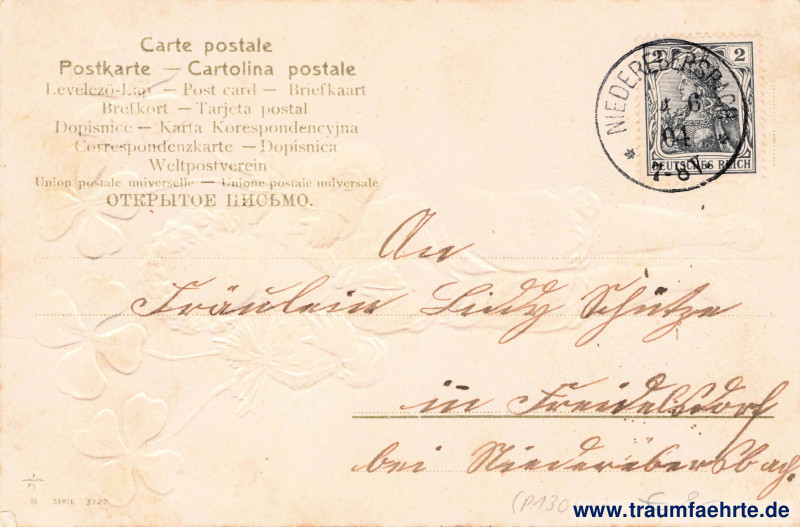 – Details – Jahr: ca. 1895 Status: gelaufen 1904 Beschriftung vorne: Ich gratuliere zum Geburtstag. Beschriftung hinten: Carte postale, Postkarte – Cartolina postale, Levelezö-Lap – Post card – Briefkaart, Brefkort – Tarjeta postal, Dopisnice – Karta Korespondencyjna, Correspondenzkarte – Dopisnica, Weltpostverein, Union postale universelle – Unione postale universale, Открыткое письмо. [PT], B, Serie 3720 Stempel: Niederebersbach, * *, [4] 6 04 7–8V. Hinweis: