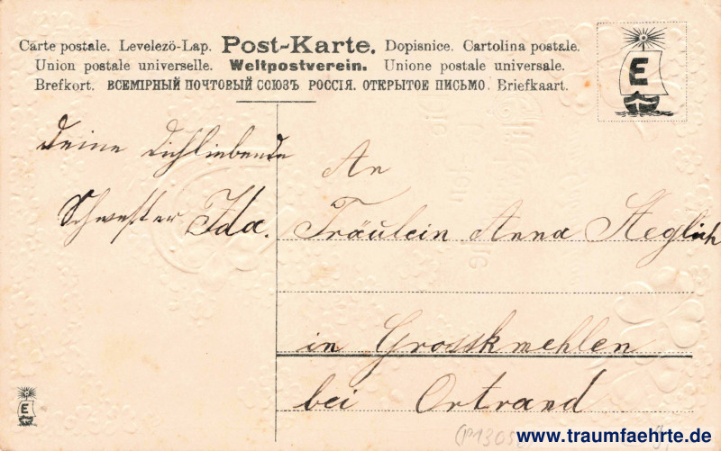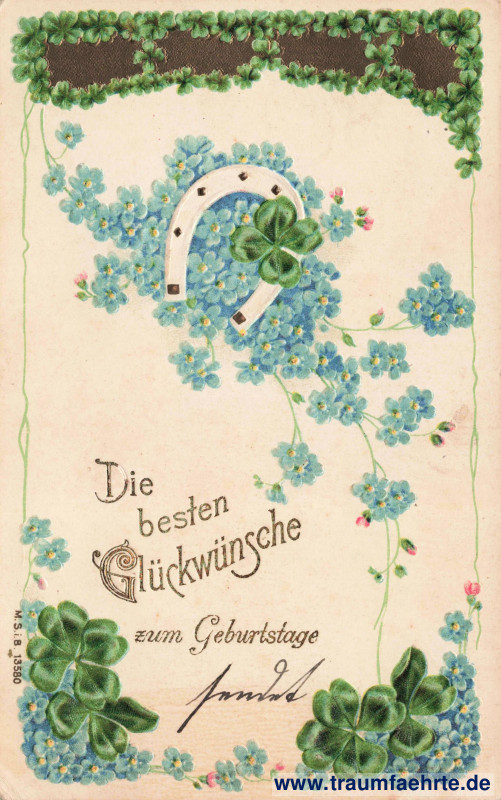 – Details – Jahr: CA. 1905 Status: beschrieben, aber ungelaufen Beschriftung vorne: Die besten Glückwünsche zum Geburtstage, M. S. i. B. 13580 Beschriftung hinten: Carte postale. Levelezö-Lap. Post-Karte. Dopisnice. Cartolina postale. Union postale universelle. Weltpostverein. Union postale universale. Brefkort. Всемірный союзъ Россія. Открытое письмо. Briefkaart. E, E Stempel: keine Hinweis: