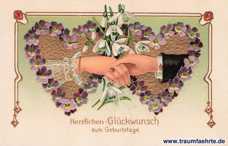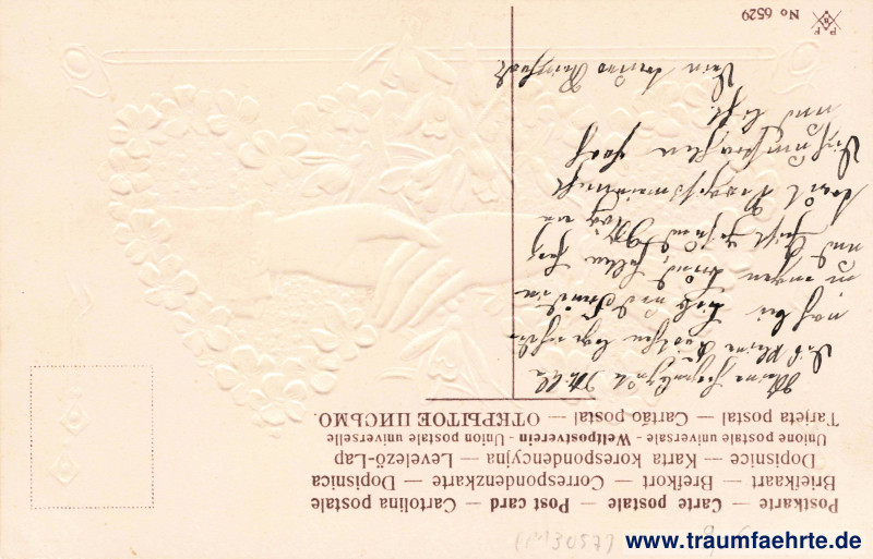 – Details – Jahr: ca. 1905 Status: beschrieben, aber ungelaufen Beschriftung vorne: Herzlichen Glückwunsch zum Geburtstage. Beschriftung hinten: Postkarte – Carte postale – Post card – Cartolina postale, Briefkaart – Brefkort – Correspondenzkarte – Dopisnica, Dopisnice – Karta korespondencyjna – Levelezö-Lap, Unione postale universale – Weltpostverein – Union postale universelle, Tarjeta postale – Cartão postal – Открытое письмо. P F B, No 6529 Stempel: keine Hinweis: