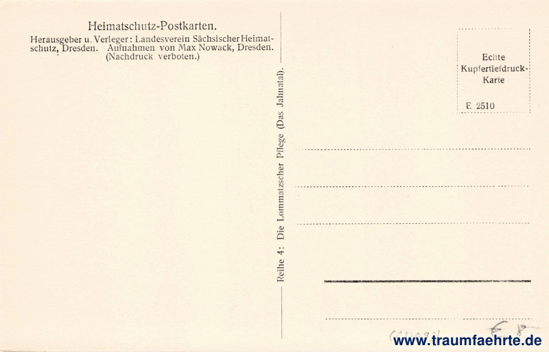 – Details – Jahr: ca. 1920 Status: ungelaufen Beschriftung vorne: Mochau b. Döbeln. Beschriftung hinten: Heimatschutz-Postkarten. Herausgeber u. Verleger: Landesverein Sächsischer Heimatschutz, Dresden. Aufnahmen von Max Nowack, Dresden. (Nachdruck verboten.) Reihe 4: Die Lommatzscher Pflege (Das Jahnatal). Echte Kupfertiefdruck-Karte, E 2510 Stempel: keine Hinweis: