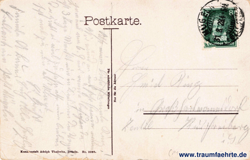 – Details – Jahr: ca. 1925 Status: gelaufen 1928 Beschriftung vorne: Kiebitz von der Tronitzer Höhe aus gesehen. Berghäuser. Beschriftung hinten: Postkarte. Kunstanstalt Adolph Thallwitz, Döbeln. Nr. 3329. Stempel: Mügeln (Bz. Leipzig), 31.8.28.4–5N. Hinweis: