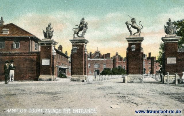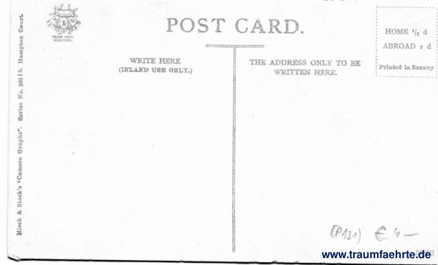 – Details – Year: ca. 1905-1915 Postal state: postally unused Inscription front: Hampton Court Palace the entrance Inscription back: Post Card. Write here (inland use only.), The address only to be written here. Home ½ d, Abroad 1 d, Printed in Saxony, M & S, Trade mark (registered), Misch & Stock's Camera Graphs. Series No. 595|5. Hampton Court. 53802 Postmark(s): none Please note: