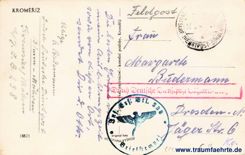Stempel: Deutsche Dienstpost – Böhmen[–Mähren…]; Durch Deutsche Dienstpost Böhmen–Mähren, Briefstempel Inf. Ers. Btl. 238