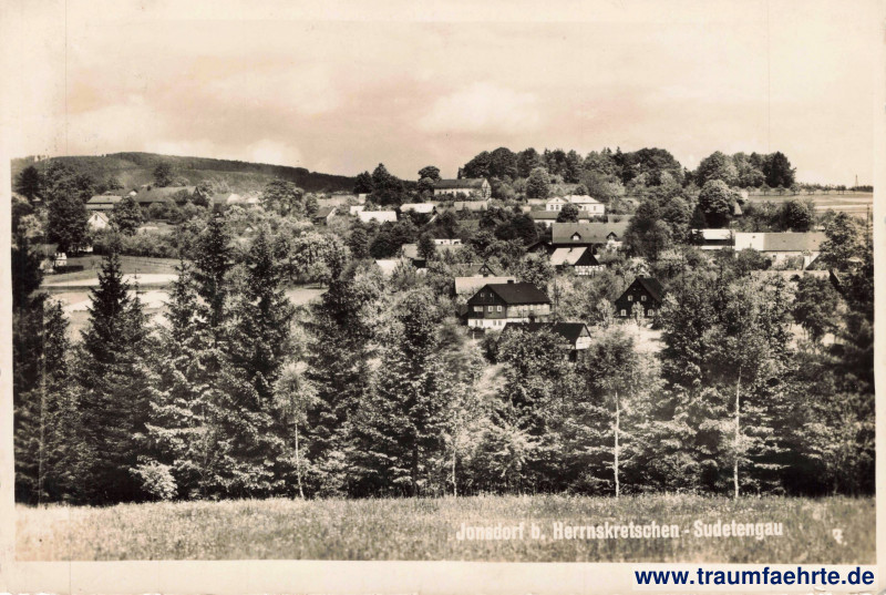 Ansichtskarte Panorama Jonsdorf b. Herrnskretschen / Janov in Jonsdorf bei Herrnskretschen / Janov u Hřenska [ Permalink ]Schlagworte: Panorama, Felder, Hügel, Zweiter Weltkrieg, Sudetenland, Böhmen
