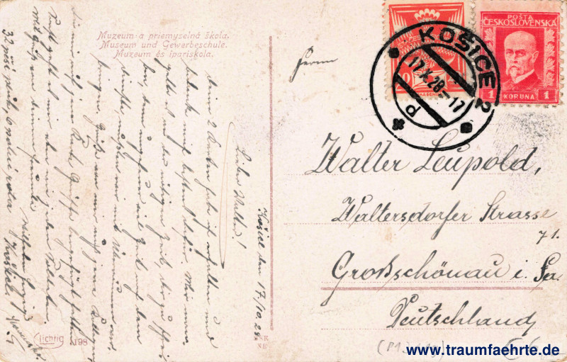 – Details – Year: ca. 1925 Postal state: postally used 1028 Inscription front: Košice Inscription back: Muzeum a priemyselná škola. Museum und Gewerbeschule. Muzeum és ipariskola. Lichtig, 1198, SSE NE Postmark(s): Košice, * * *, 17.X.28–17 Please note: