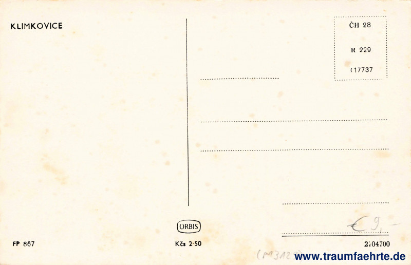 Beschriftung hinten: Klimkovice, Orbis, FP 867, Kčs 2·50, 2704700, ČH 28, R 229, [c]17737