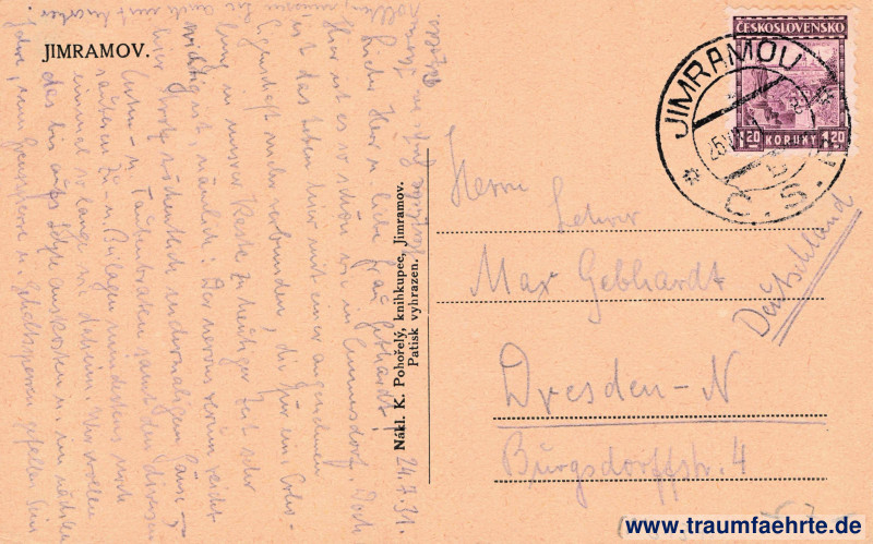 – Details – Jahr: ca. 1930 Status: gelaufen 1931 Beschriftung vorne: kein Text Beschriftung hinten: Nákl. K. Pohořelý, knihkupec, Jimramov. Patisk vyhrazen. Stempel: Jimramov, * Č.S.P *, b, 25.VII.31 […]8 Hinweis: