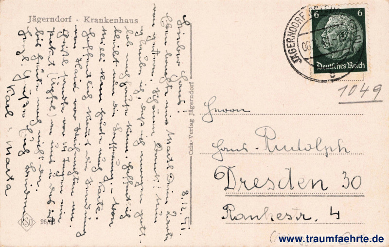 Beschriftung hinten: Jägerndorf – Krankenhaus, Cela-Verlag Jägerndorf, KSO, 26/[08]