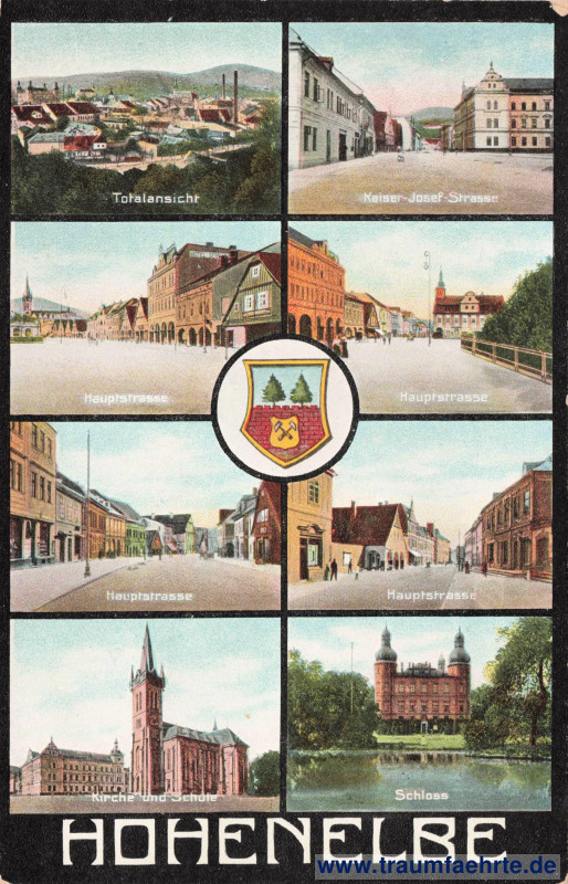 Beschriftung vorne: Hohenelbe, Totalansicht, Kaiser-Josef-Strasse, Hauptstrasse, Hauptstrasse, Hauptstrasse, Hauptstrasse, Kirche und Schule, Schloss
