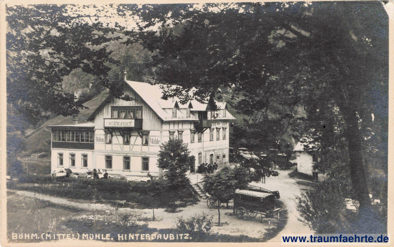Beschriftung vorne: Böhm. (Mittel) Mühle. Hinterdaubitz. Restaurant Böhm. Mühle