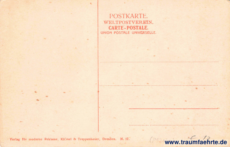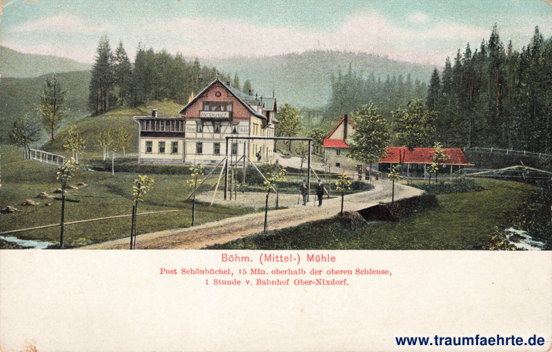 – Details – Jahr: ca. 1905 Status: ungelaufen Beschriftung vorne: Böhm. (Mittel-) Mühle. Post Schönbüchel, 15 Min. pberhalb der oberen Schleuse, 1 Stunde v. Bahnhof Ober-Nixdorf. Beschriftung hinten: Postkarte. Weltpostverein. Carte postale. Union postale universelle. Verlag für moderne Reklame, Kühnel & Treppenhauer, Dresden. N. 17. Stempel: keine Hinweis:
