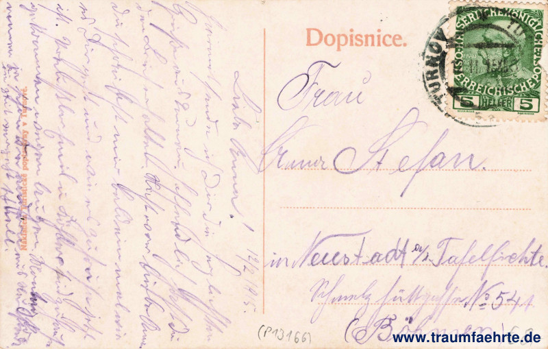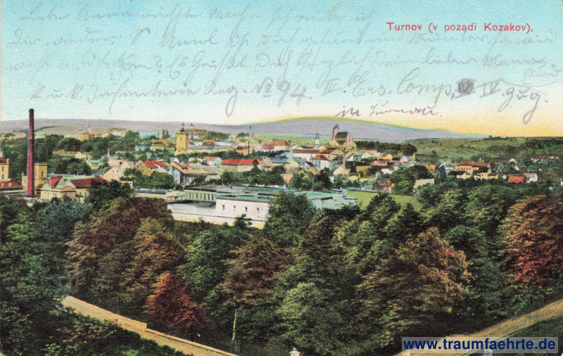– Details – Jahr: ca. 1910 Status: gelaufen 1915 Beschriftung vorne: Turnov (v pozadi Kozákov). Beschriftung hinten: Dopisnice. Stempel: Turnov * Turnau, […] 12.II.15 XII[…] Hinweis: