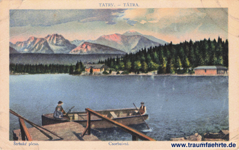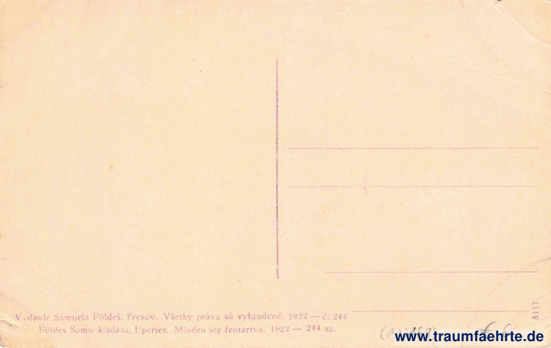 – Details – Year: 1922 Postal state: postally unused Inscription front: Tatry – Tátra. Štrbské pleso. Csorbaí-tó. Csorber-See. Inscription back: Vydanie Sámuela Földeš, Prešov. Všetky práva sú vyhradené. 1922 – č. 244, Földes Samu kiadása, Eperjes. Minden jog fentartva. 1922 – 244 sz. 5111 Postmark(s): none Please note: