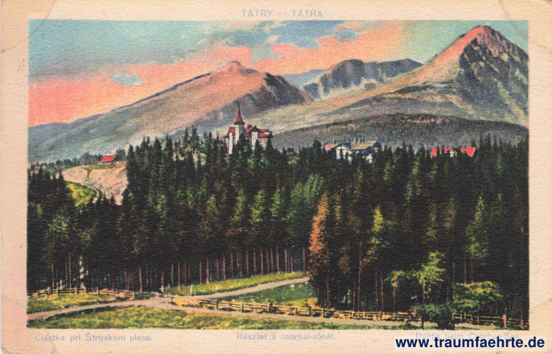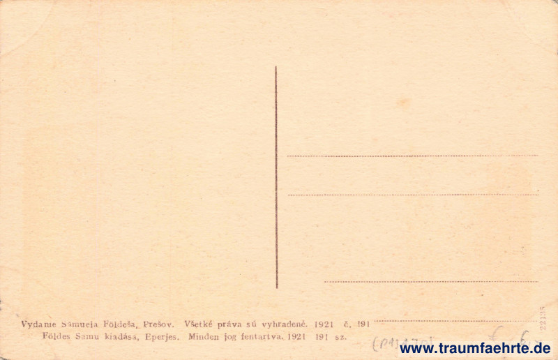 – Details – Year: 1921 Postal state: postally unused Inscription front: Tatry – Tátra. Čiastka pri Štrbskom plese. Részlet a csorbaí-tónál. Partie beim Csorber-See. Inscription back: Vydanie Sámuela Földeš, Prešov. Všetky práva sú vyhradené. 1921, č. 191, Földes Samu kiadása, Eperjes. Minden jog fentartva. 1921, 191 sz. 22135 Postmark(s): none Please note: