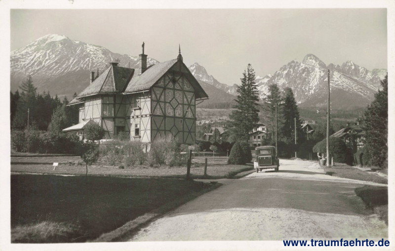 Ansichtskarte Villa Kalinčiak in Hohe Tatra / Mesto Vysoké Tatry [ Permalink ]Schlagworte: Villen, Oldtimer, Strommasten, Wiesen, Berge, Gebirge, Tatra