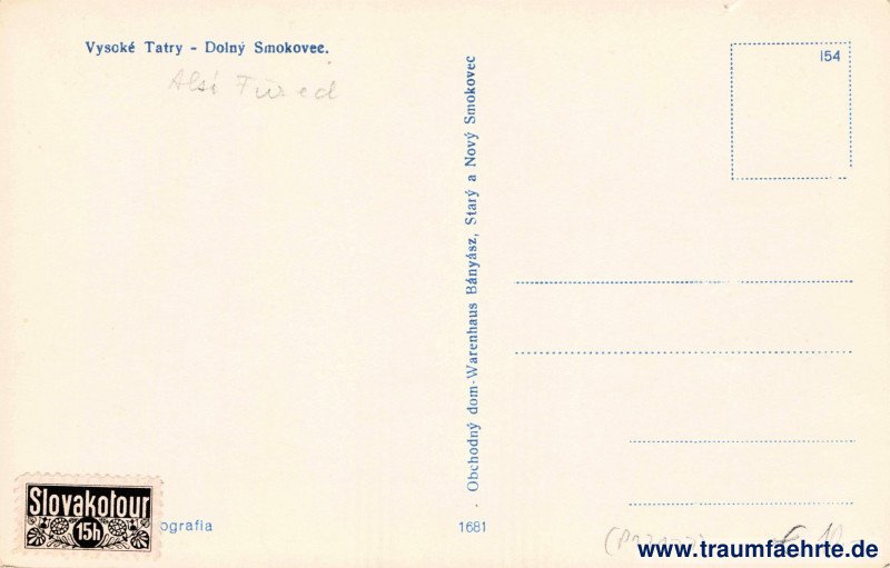 – Details – Jahr: ca. 1940 Status: ungelaufen Beschriftung vorne: kein Text Beschriftung hinten: Vysoké Tatry – Dolný Smokovec. Obchodný dom – Warenhaus, Bányász, Starý a Nový Smokovec, 1681, […]ografia, 154 Stempel: Slovakotour, 15h Hinweis: