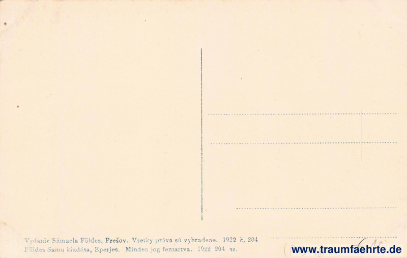 – Details – Year: 1922 Postal state: postally unused Inscription front: Tatry: Štrbské pleso. – A. Magas Tatra. – Die Hohe Tatra. Csorbai-tó. – Csorber See. Inscription back: Vydanie Sámuela Földeš, Prešov. Všetky práva sú vyhradené. 1922, č. 204, Földes Samu kiadása, Eperjes. Minden jog fentartva. 1922, 204 sz. Postmark(s): none Please note: