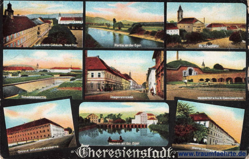 Beschriftung vorne: Theresienstadt. K. u. k. Genie-Gebäude. Neue Post. Partie an der Eger. Paradeplatz. Schanzenpartie. Pragerstrasse. Wassertor u. k. u. k. Gemüsegärten. Grosse Infanteriekaserne. Mühlen an der Eger. Kleine Infanteriekaserne.