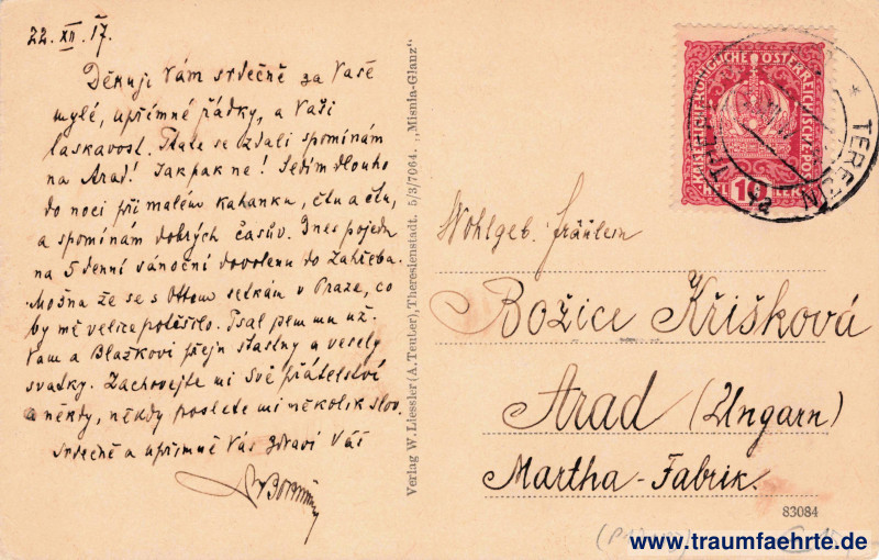Beschriftung hinten: Verlag W. Liessler (A. Teuter), Theresienstadt, 5/3/7064. „Misnia-Glanz“, 83084