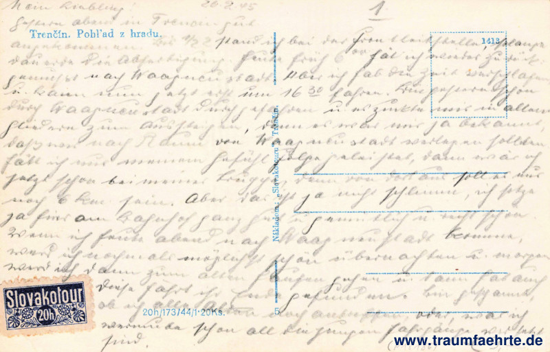 – Details – Jahr: ca. 1940 Status: beschrieben 1945, aber ungelaufen Beschriftung vorne: kein Text Beschriftung hinten: Trenčín. Pohl'ad z hradu. 20h/173/44/1·20Ks. Nákladom: „Slovakotouru“, Trenčín. Stempel: Slovakotour, 20h Hinweis:
