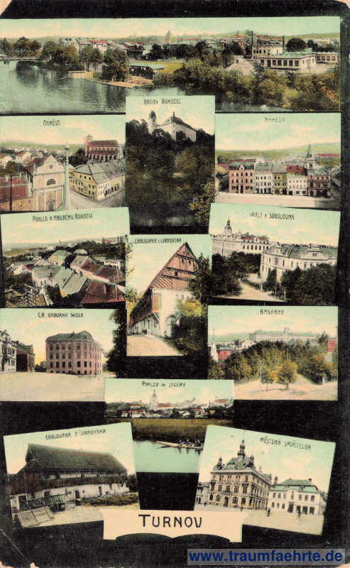 farbig mit zwölf Ansichten – 1.) Panorama von Turnau / Turnov mit Iser / Jizera, Anlegestelle, Häusern und Schornsteinen, 2.) Platz mit Säule und Eckhäusern, 3.) Schloss mit Turm auf Hügel im Wald, 4.) Platz mit Turm, 5.) Panorama mit Häusern und Bäumen, Hügel im Hintergrund, 6.) Straße mit Haus, Sträuchern und Bäumen, 7.) Allee, Schulgebäude, Turm und Masten, 8.) Platz mit Häusern und Schulgebäude, 9.) Kaserne, 10.) Obere Kaserne mit Park davor, 11.) Iser mit Ruderboot, Wiese, Panorama von Turnau mit Kirche und Turm im Hintergrund, 12.) Platz mit Passanten und Villen inkl. Bankgebäude