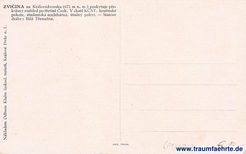 – Details – Jahr: ca. 1920 Status: ungelaufen Beschriftung vorne: kein Text Beschriftung hinten: Zvičina na Královédvorsku (671 m n. m.) poskytuje překrásný rozhled po třetině Čech. V chatě KČST. hostinské pokoje, studentská noclehárna, útulný pobyt. – Stanice dráhy: Bílá Třemešná. Nákladem Odboru Klubu českosl. turistů, Králové Dvůr n. L. Unie, Praha. Stempel: keine Hinweis: