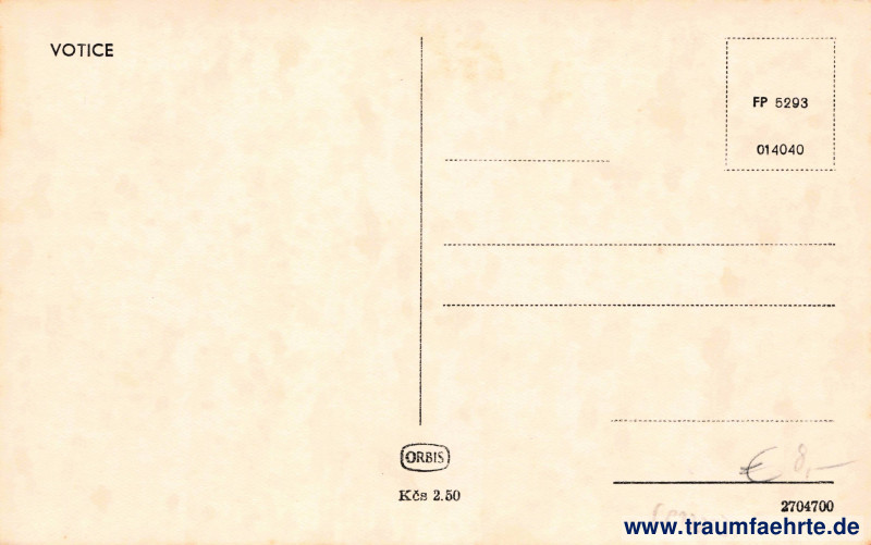 – Details – Year: ca. 1950 Postal state: postally unused Inscription front: Za mir, za vlast, za socialismus, Pramen, [Chanodroga] Inscription back: Votice, Orbis, Kčs 2.50, 2704700, FP 5293, 014040 Postmark(s): none Please note: