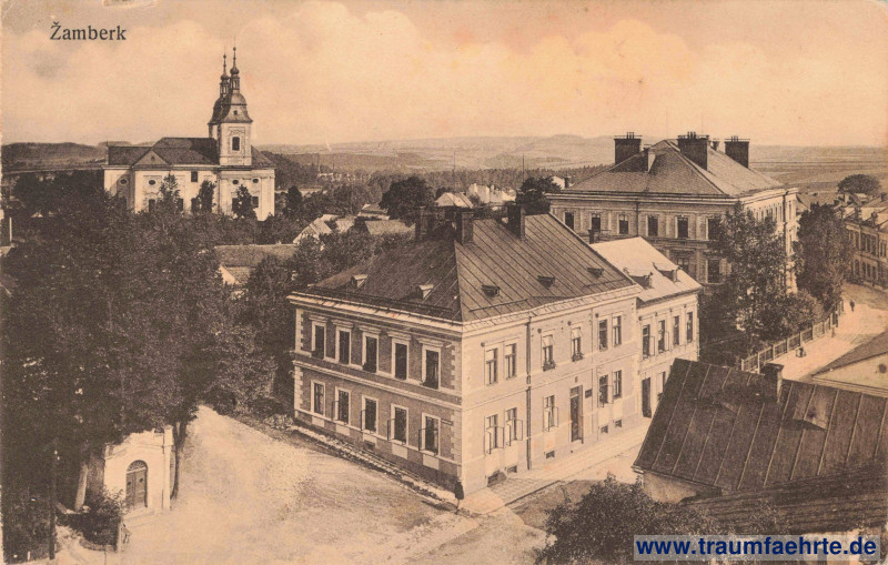 Schwarzweißfotografie – Bahnhofsstraße / Nádražnímit Bäumen und Zaun, Eckhaus Nádražní 468, daneben Nádražní 550 und Gymnasium Žamberk (Nádražní 48), Park mit Kapelle(?) im Vordergrung, Waclawskirche / Kostel svatého Václava mit Türmen, Felder und Hügel im Hintergrund