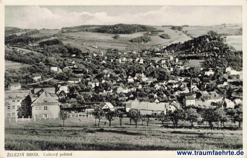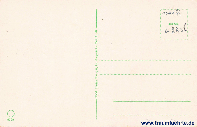 – Details – Year: ca. 1930 Postal state: written on, but not used postally Inscription front: Železný Brod. Celkohý pohled Inscription back: O 0709, Nakl. Jindra Harapát, knuhkupecivi v Žel. Brodé. 404662 Postmark(s): none Please note: