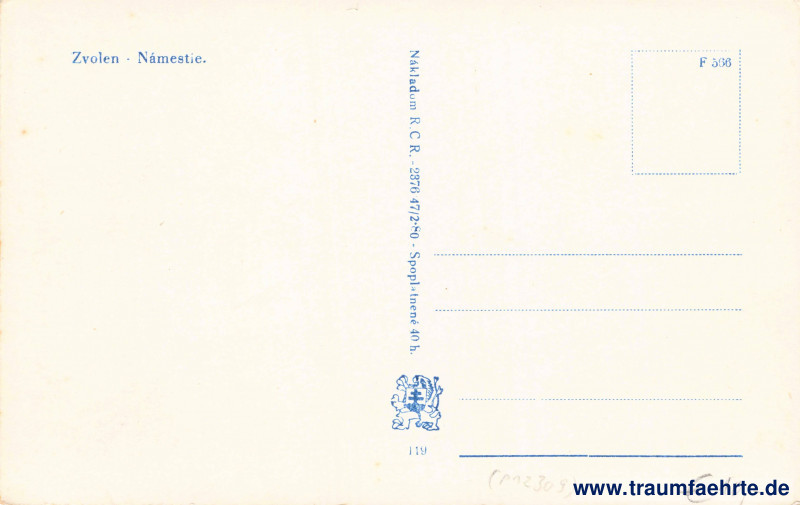 – Details – Jahr: ca. 1950 Status: ungelaufen Beschriftung vorne: Nehera, […] Beschriftung hinten: Zvolen – Námestie. Nákladom R.C.R. – 2376 – Spoplatené 40 h. 119, F 566 Stempel: keine Hinweis: