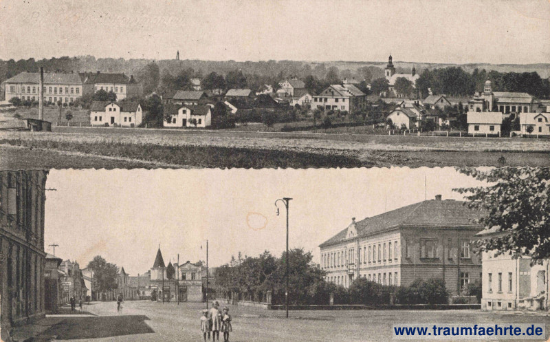 Schwarzweißfotografie mit zwei Ansichten – 1.) Panorama von Rattimau / Vratimov mit Kirche, Türmen und Schornstein, Felder im Vordergrund, Wald im Hintergrund, 2.) heutige Friedecker Straße (Frýdecká) und Masarykplatz (Masarykovo náměstí) mit Kindern, Laternen, Häusern, Turm und heutigem Grundschulgebäude