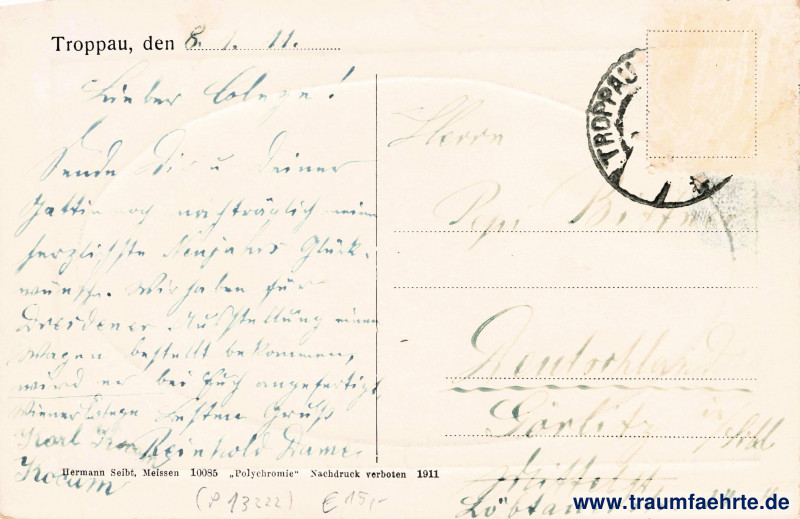 Beschriftung hinten: Troppau, den … Hermann Seibt, Meissen, 10085 „Polychromie“, Nachdruck verboten, 1911