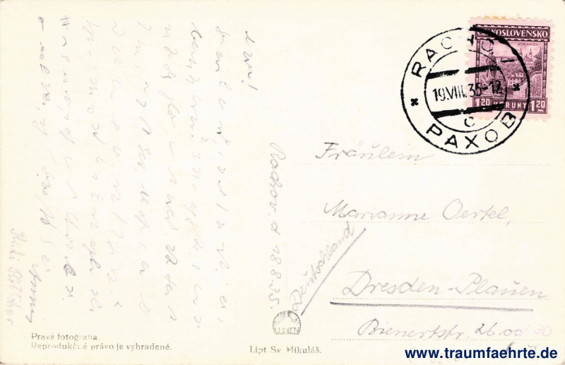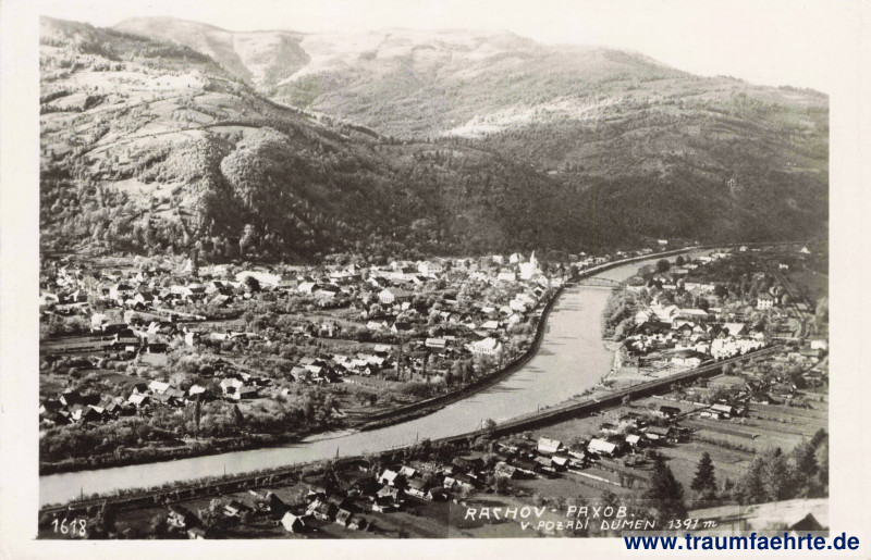– Details – Jahr: ca. 1930 Status: gelaufen 1935 Beschriftung vorne: 1618, Rachov – Рахов. V pozadi Dumen 1391 m. Beschriftung hinten: Pravá fotografia. Reprodukčné právo je vyhradené. Lumen, Lipt. Sv. Mikuláš. Stempel: Rachov, Рахов, c, * *, 19.VIII.35–12 Hinweis: