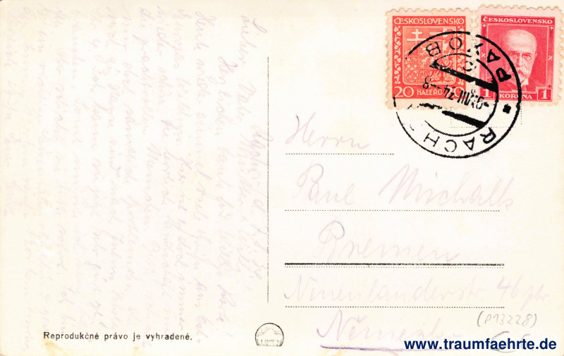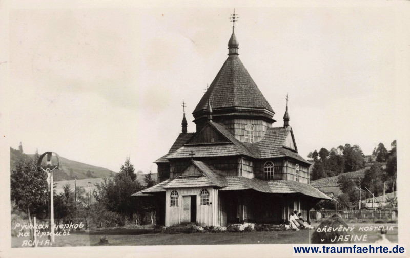 – Details – Jahr: ca. 1930 Status: gelaufen 1934 Beschriftung vorne: Руськая церков на Стрицьі, Ясіня. Dřevěný kostelík v Jasine. Beschriftung hinten: Reprodukčné právo je vyhradené. Lumen Stempel: Rach[ov], Рахов, c, * *, –9.VIII.34–8 Hinweis: