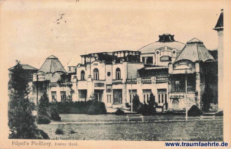 Inscription front: Kúpel'e Piešťany. Irminy lázně. Bad Pistyan. Irma-Bad.