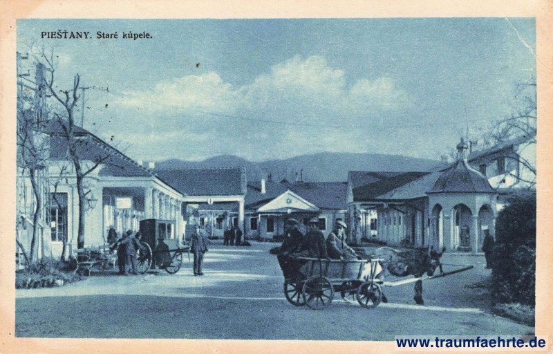 Ansichtskarte Alte Badeanstalt / Staré kúpele in Pistyan / Pistian / Püschtin / Piešťany [ Permalink ]Schlagworte: Kurorte, Kutschen, Säulen, Pavillons, Männer, Hecken, Berge, Gebirge, Karpaten